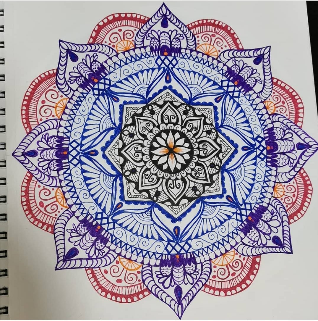 I always start in the middle never on page one. Art has been a form of therapy for as long as I can remember. I love to draw mandalas. This is one of the few I drew over lockdown.